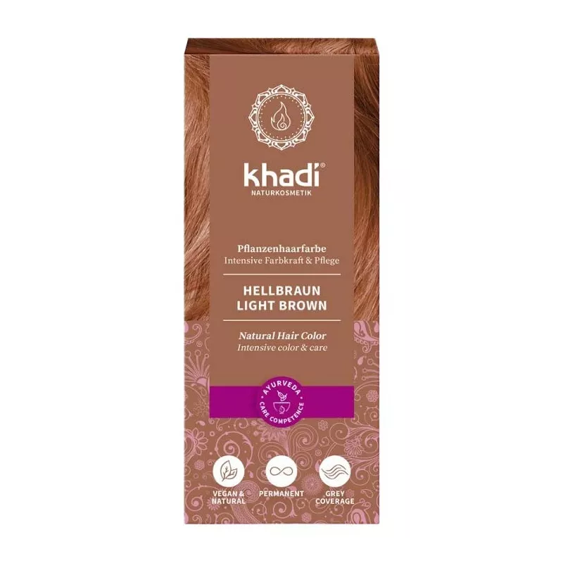Diese Khadi Pflanzenhaarfarbe färbt die Haare hellbraun. Dabei wird die neue Haarfarbe von der natürlichen Haarfarbe mitbestimmt.