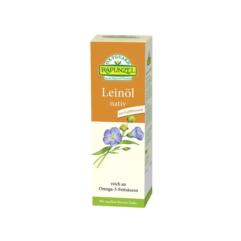 Rapunzel OXYGUARD® Leinöl nativ ist eine hervorragende Quelle für mehrfach ungesättigte Fettsäuren, die für den Menschen lebensnotwendig sind. Die essentielle 3-fach ungesättigte Linolensäure ist in hoher Konzentration enthalten (53,3g pro 100 g Öl).