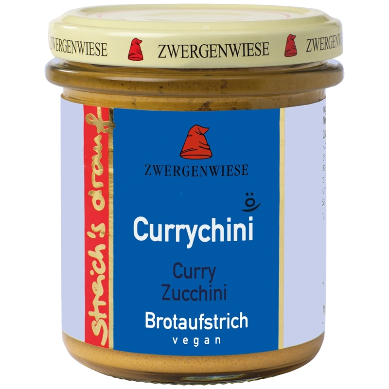 Zwergenwiese Streich's drauf Currychini ist ein leicht cremiger vegetarischer Bio-Brotaufstrich mit einer pikant-herzhaften Note von Zucchini, Zwiebeln, Gurken und Sonnenblumenkernen. Verfeinert mit einem Spritzer Zitronensaft.