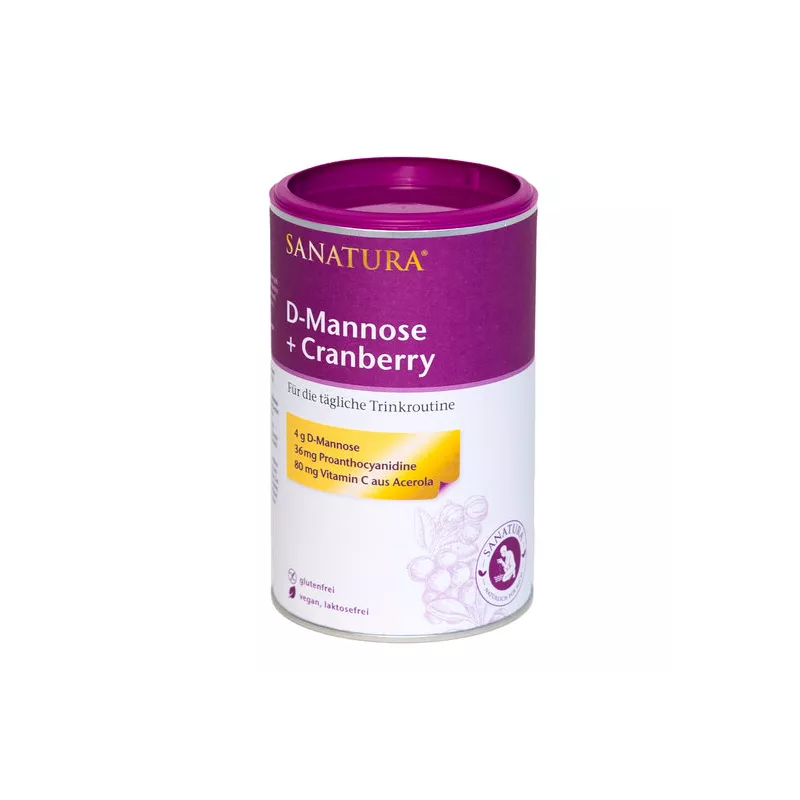 D-Mannose 50 %, Cranberrysaftpulver (Cranberrysaftpulver, Maltodextrin) 40, 5 %, Acerolasaftpulver (Acerolasaftpulver, Maltodextrin) 5 %, Cranberry-Extrakt 4, 5 %