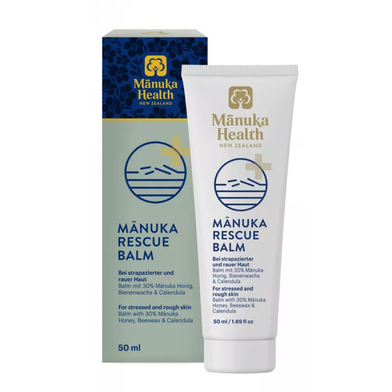 Regeneriert, pflegt und schützt die Haut, die hochwertige Manuka Rescue Balm Salbe von Manuka Health mit 30% wertvollem Manuka Honig aus der Natur Neuseelands, Calendula und Bienenwachs.