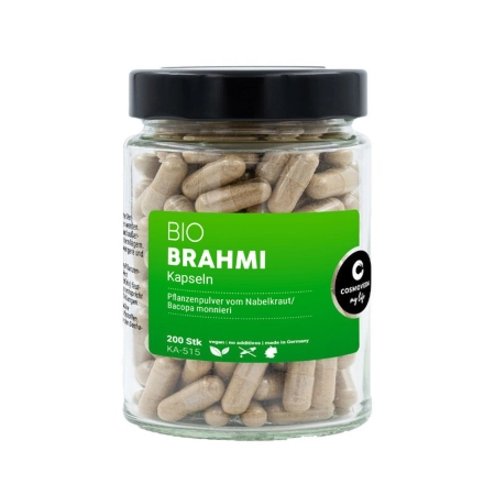 El Brahmi que se usa aquí es la hierba del ombligo de la India, el nombre botánico es Bacopa monnieri. Es una planta de un verde intenso, de hasta 40 cm de altura, con hojas pequeñas y carnosas y flores blancas, que crece en zonas húmedas y pantanosas. En la nutrición ayurvédica se utilizan partes del brote, pero también la raíz, el tallo y las hojas. El polvo molido fina y suavemente (a temperaturas inferiores a 40 °C) de la planta entera seca proviene de proyectos orgánicos y de comercio justo de India y Sri Lanka.