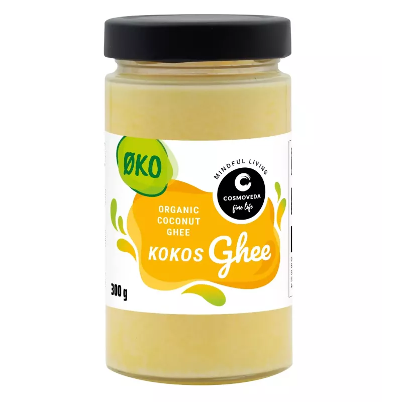 El ghee de coco COSMOVEDA combina las ventajas del ghee y la refrescante grasa de coco. Es ideal para guisar, hervir y cocer al vapor verduras y dal, así como para refinar platos cocinados. Use como ghee o aceite de coco.
