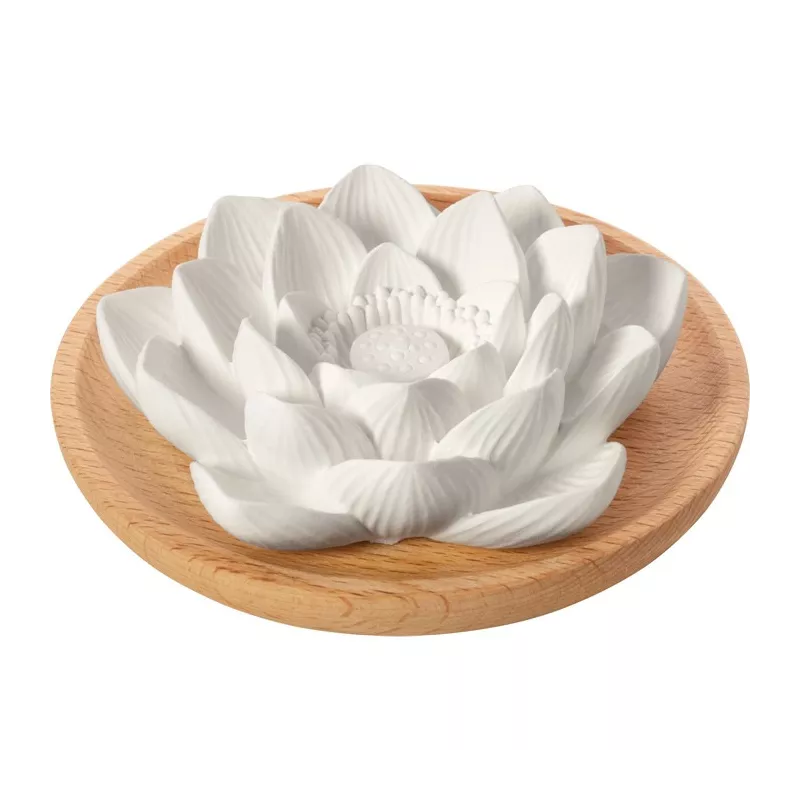 La piedra aromática de flor de loto de cerámica viene con una placa de madera de haya a juego como base.