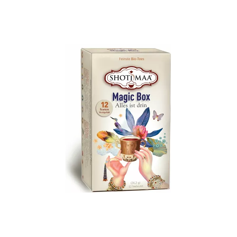 La Magic Box combine tous les 12 Variétés Shoti Maa Thé dans une Boîte et un lieu de Cadeaux pour lui et ses Amis avec un consommation de thé soin de vous. Elle s'ouvre comme un petit coffre au Trésor avec 2 Compartiments pour les Chakra, et des Éléments de Thé. Pour ce faire, il y a une inspiriende Addition à collectionner ou à Offrir. Chaque Sachet de thé est à Aromaschutz scellé individuellement.
