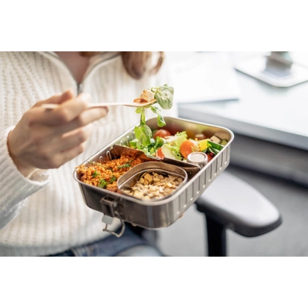 Tutte le parti sono realizzate in acciaio inossidabile 18/8 di alta qualità e il contenitore per il pranzo è anche a prova di perdite grazie all'anello in silicone alimentare utilizzato nel coperchio. -